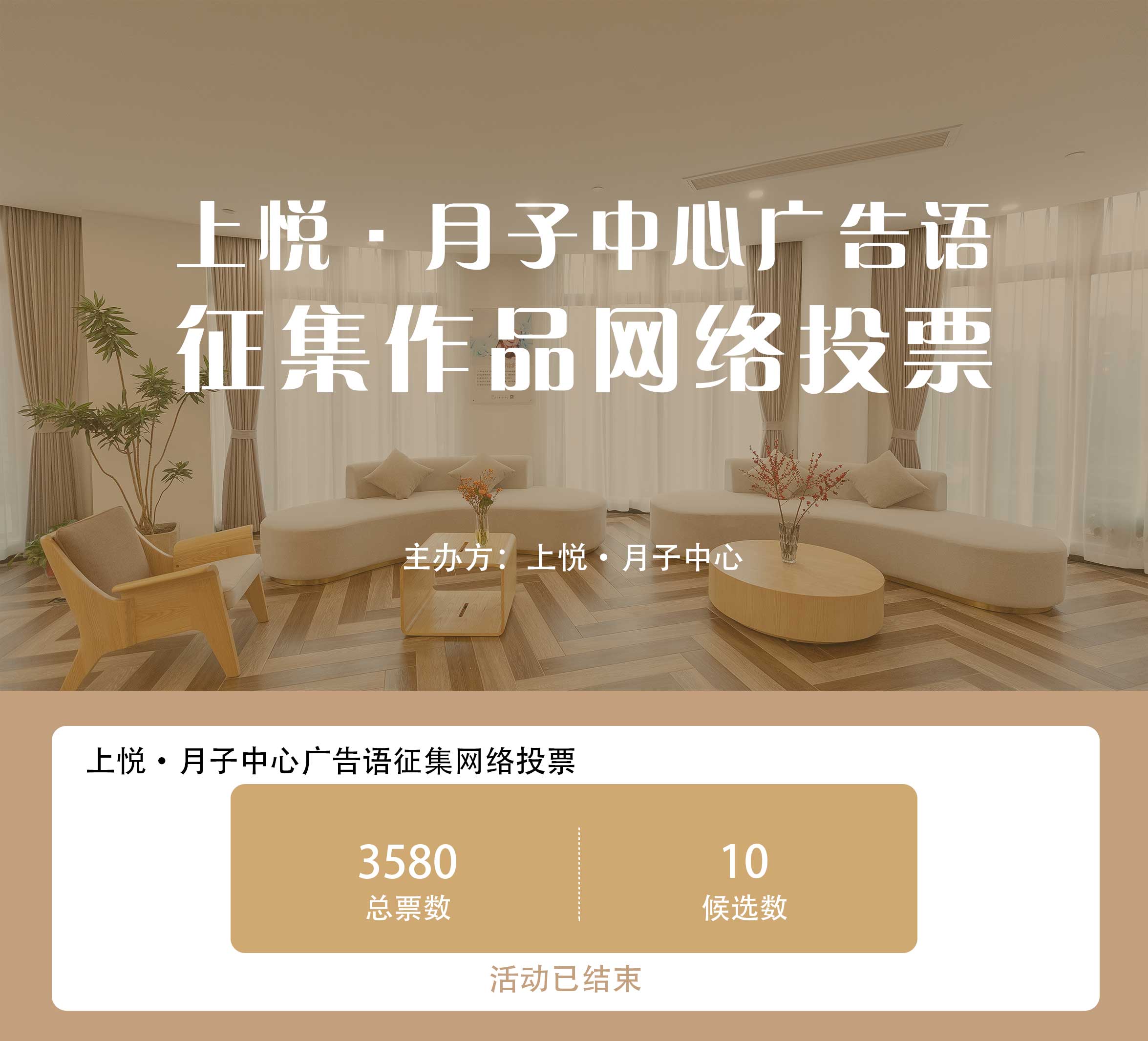 源自于心,行之于愛。為進一步提升上悅·月子中心品牌傳播力與影響力,展現(xiàn)品牌內(nèi)涵、彰顯品牌價值,9月28日上悅·月子中心向全網(wǎng)優(yōu)秀創(chuàng)作者征集廣告語活動,經(jīng)過4天的激烈比拼,秉承著“公開、公平、公正”原則,全程線上評選,且由網(wǎng)友投票為依據(jù),最終按獲得票數(shù)多少評選出前五名獲獎?wù)?,于今天上悅·月子中心開業(yè)盛典現(xiàn)場領(lǐng)取獎品。